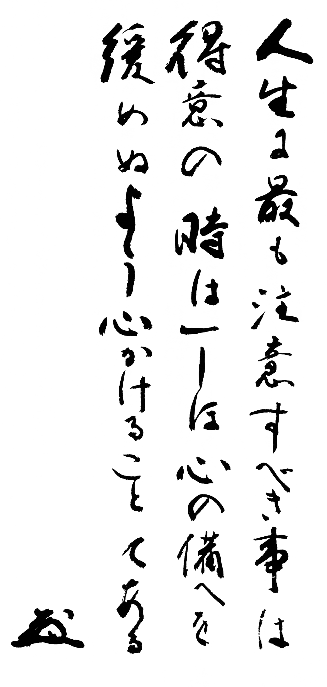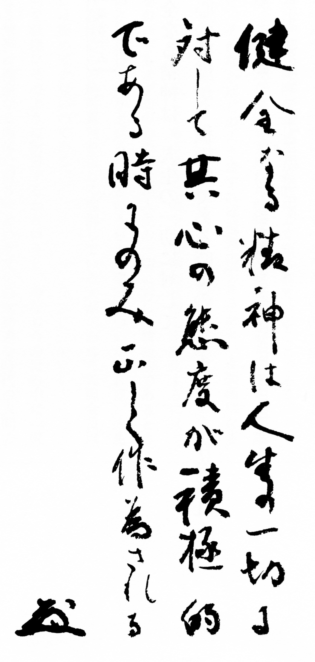 この理由により、諸君がすでに知っているように、私は常に「完全なる人生」に生きるには、先ずその先決問題として、心の態度を積極的に堅持せよと力説し、積極精神作成の要点の中に、「有事無事若無心(註・有事も無事も無心の如く)」という、すなわち執着なき心を平常心として、人事世事一切の人生に対応処置すべしと説いているのである。